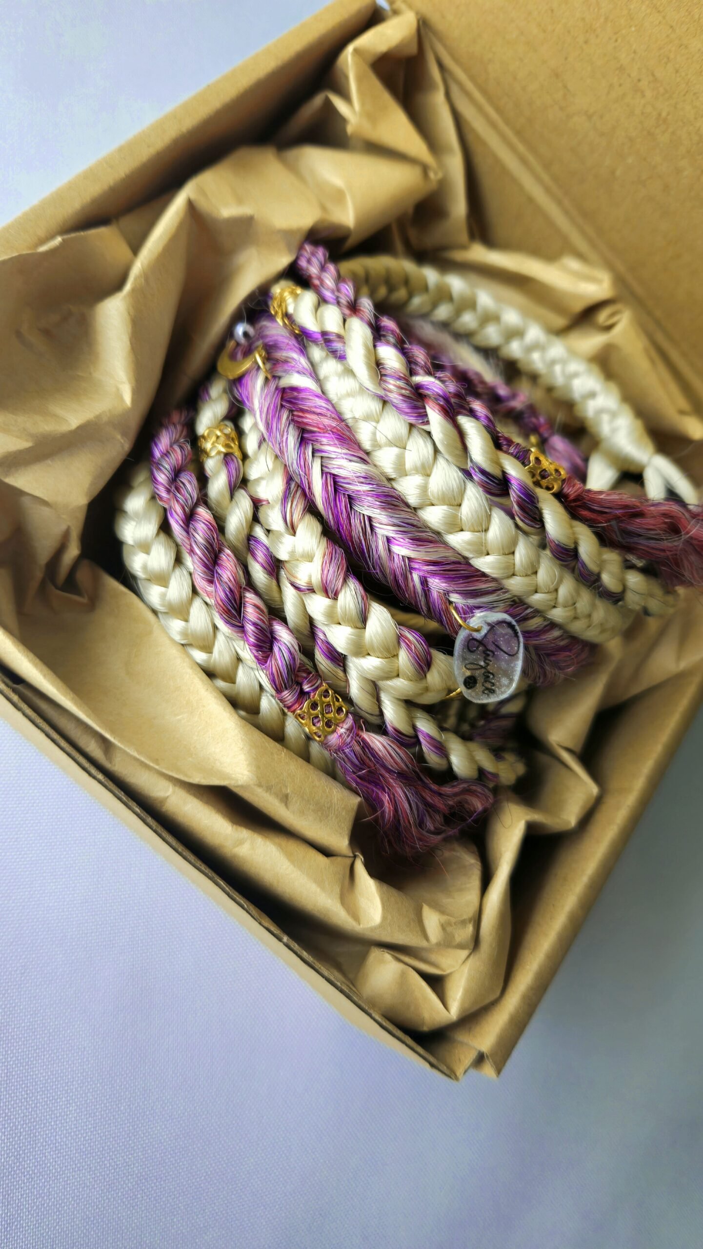 La méthode de travail utilisée vous garantie une durabilité du produit d’au moins 2 ans, avec un bon entretien. Utilisez un élastique classique pour attacher vos cheveux puis posez votre élastique tressé SAGACE23 par-dessus. À laver avec un mélange d’eau tiède et d’un peu de shampoing. Un service d’entretien est disponible par nos soins.